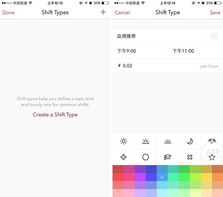 在 Shifts 中用户可以将自己的工作任务定义为 Shift Type,填写相应的名称、时段以及工作效率(可选),并选择一种标识来代表这项日程,以便于在月历中更好地识别。