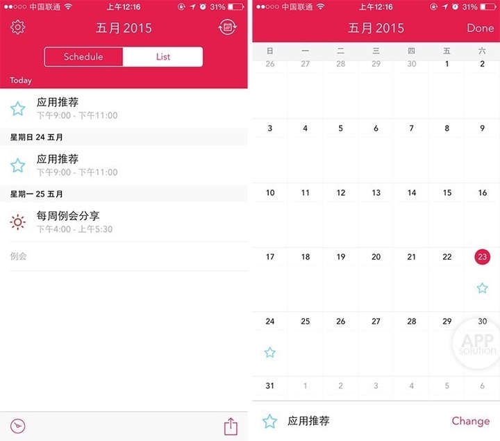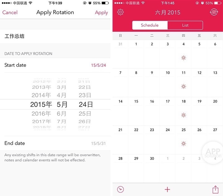 定义好 Shift Type 之后需要为它添加适用日期,一周/一月中有哪些天的工作是这一种 Shift Type,则勾选相应的日子。此时月历中将显示用户之前选择的标识,清晰明了,而 List 模式则会列表化呈现用户的所有日程。另外,用户也可以为每一天添加附注,备忘一些事宜。