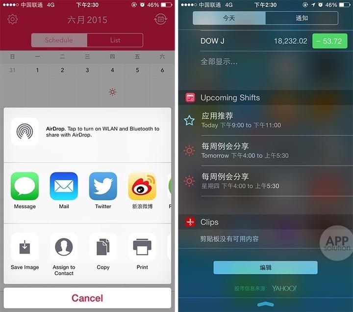 在通知中心添加 Shifts 的插件,将会显示即将到来的 shift 内容。用户可以在应用内设置接受推送,以便在 shift 开始前收到提醒。另外 Shifts 还可以读取来自系统日历的内容。