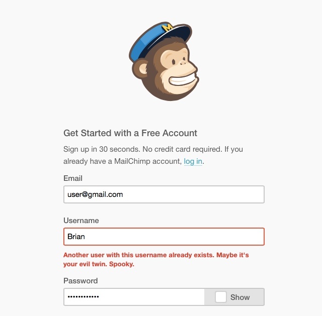 若 ID 已被注册,MailChimp 会坏坏的提示说 Maybe it’s your evil twin.Spooky.