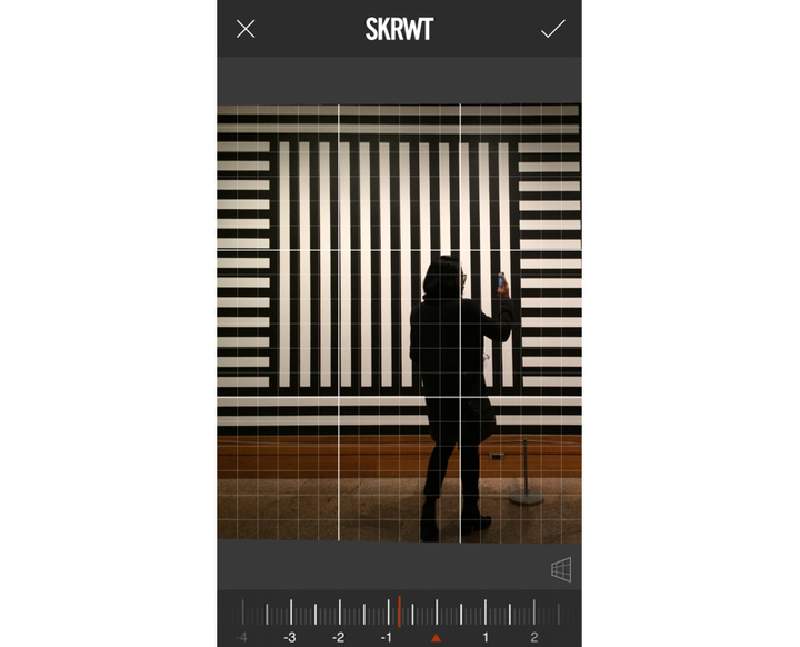 类似的这些微调在 Instagram, Snapseed 也能实现,甚至 Snapseed 在调畸变的同时还会将出现的边缝自动填充上背景色彩和纹路。而 SKRWT 调整畸变的幅度控制比较大,甚至可以实现类鱼眼效果和令人眩晕的「第六感」扭曲图像。
