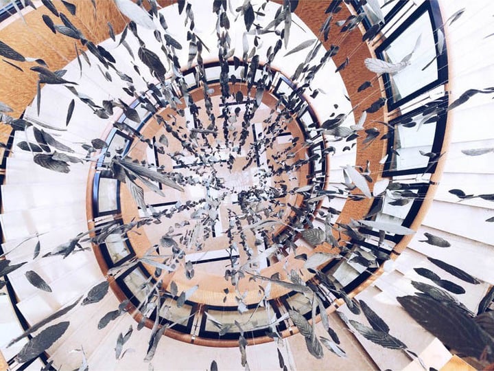 下面这张是从一个选择楼梯向下俯拍的,而那些悬挂的掉缀有些时空通道碎片感,为了更体现一种速度感和位移感,这张图片利用 SKRWT 稍微加重一点畸变效果。
