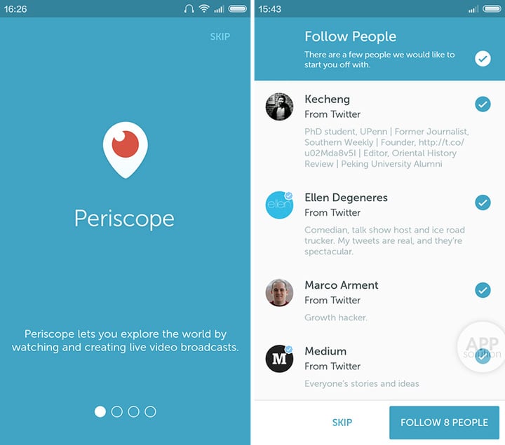 Periscope 向用户提供实时的流媒体直播服务。这款 app 于今年一月被 Twitter 收购,并在三月底上线了 iOS 版本。它的 Android 版本也刚刚发布。