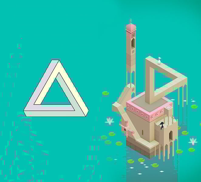 复杂的数学概念(比如潘洛斯三角,莫比乌斯环)在「纪念碑谷」中得到了完美地展现。潘洛斯三角是典型的利用视觉欺骗,产生不可能的三维建筑的案例,游戏中大量运用了这种建筑。