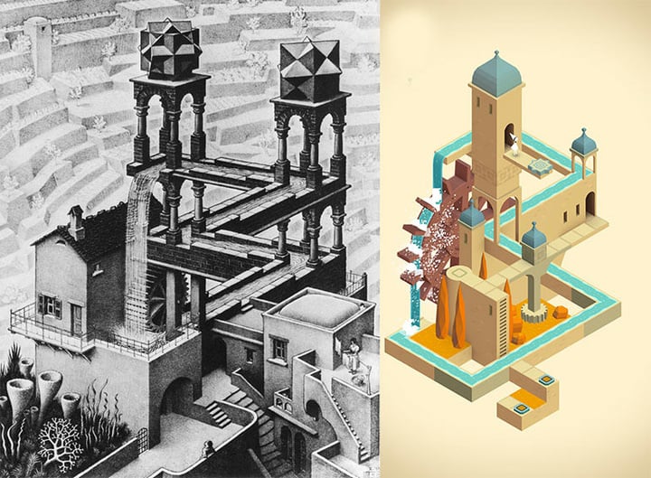 埃舍尔(M.C. Escher)是荷兰版画大师,作品多以平面镶嵌、不可能的结构、悖论等为特点,从中可以看到对分形、对称、双曲几何等数学概念的形象表达。Ken Wong 正是被他的名作《上升与下降》激发了设计灵感,游戏里也可以看到多处对埃舍尔作品的还原。