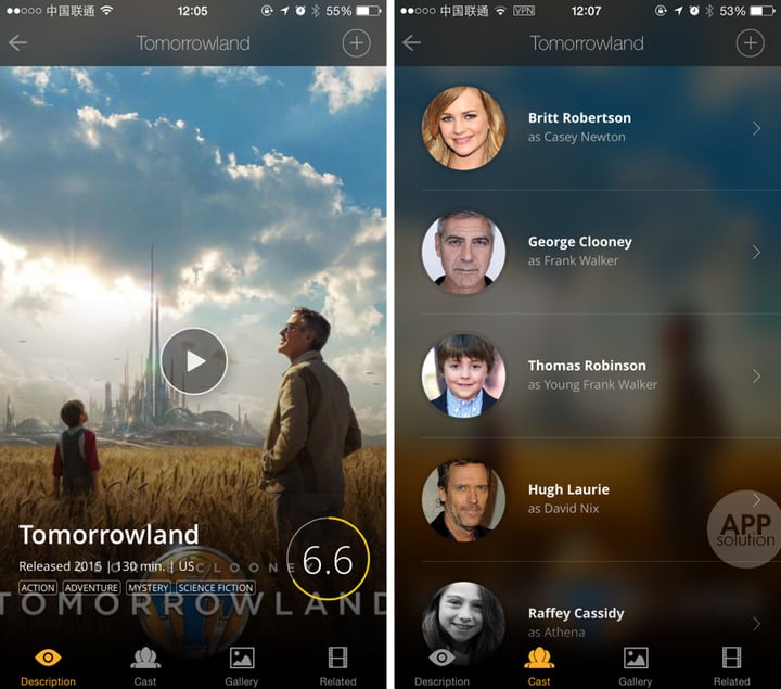 MooVee 有庞大的数据库,你喜欢的电影都能在这里找到。可以查看影片简介、演员、剧照或者相似影片,甚至还可以直接跳转到 iTunes 商店下载电影和相关书籍和原声碟。