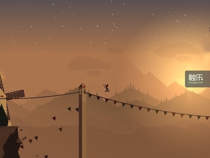 游戏场景全部采用剪影画风,加上钢琴的伴奏,让人心情舒缓。同时,由于游戏不强调释放特技与拾取道具,玩家可以在游戏中更多的欣赏风景 —— 旭日东升、艳阳高照、残阳如血、星空璀璨,一切都是那样美好。就算不小心在滑雪的过程中跌倒,重新开始也没有那么懊恼,说不定会看到不一样的景色。