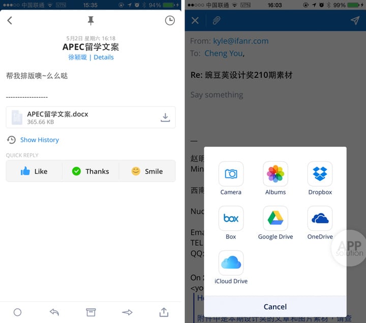 如果你已经添加了诸如 Dropbox、Google Drive 等第三方服务,除了快速地从不同的服务中添加附件以外,Spark 还可以快速地将邮件以 PDF 的形式保存发送,方便在不同的场合查阅与分享。