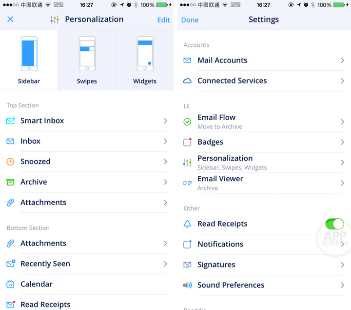 如果说功能可以被模仿或改进,一个 app 使用中的流畅感则非常难得。Spark 正好具备一点,得益于丰富细节设计与深度自定义。侧边栏能添加具有丰富功能的卡片(并且更多的卡片将会下后续版本添加),在邮件管理与查看上带来了极大的便利。