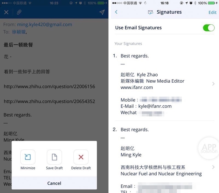 越来越多的时间,我们需要在手机上回复邮件。Spark 第一次让我感觉到这可以是一个流畅的体验:书写的过程中如需查阅其他邮件,不用保存草稿,仅需将窗口缩小至底部;完整的签名系统,Spark 会识别你曾经使用过的签名,滑动可在多个签名中自由切换;不小心发错了邮件有时候可不是小事情,Spark 允许你在 2 秒内撤回邮件,晃一晃手机也可以撤回操作。