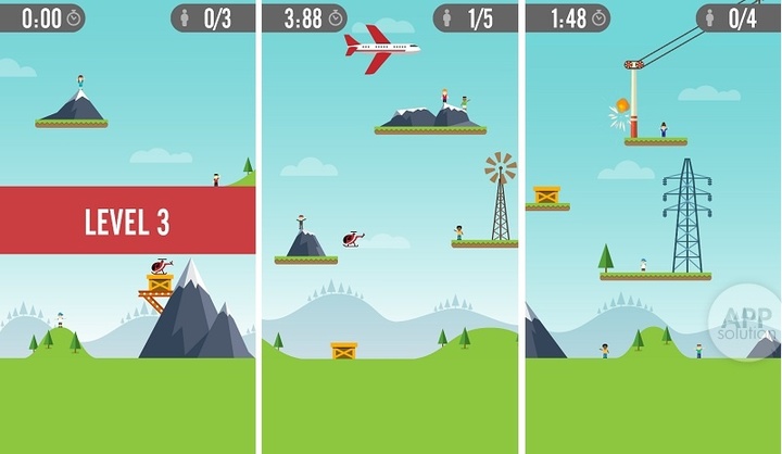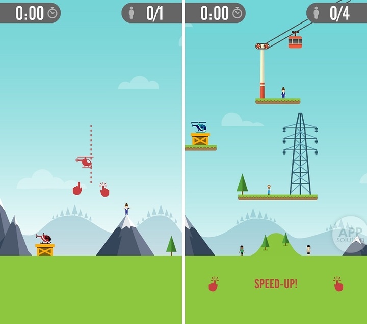 游戏包括了玩家们早已熟悉的三星评分、TapTapTap 和闯关模式。关卡开始直升机就停在停机坪上,玩家按住屏幕左边直升机向左上角飞行,按右向右上角飞行,两指按住屏幕则加速上升,松开手指直升机自动根据朝向来下降。