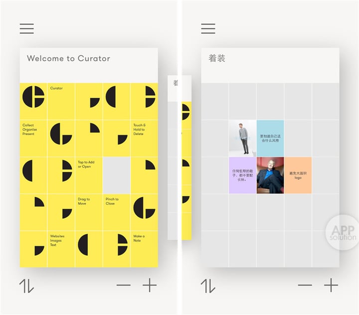 在主界面上,你可以创建或编辑 Board。Curator 按钮不多,一目了然,很容易上手。我们首先来看看 Board 的结构,它分为上下两部分,由标题和内容组成。左右滑动,可以切换查看 Board,点击它直接进入编辑页面。