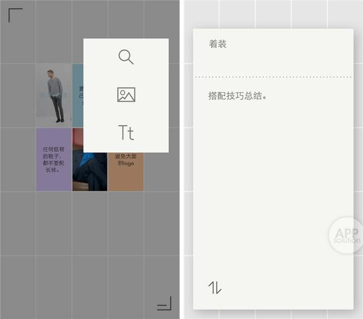 Board 上又分成很多小方块,你可以在上面插入图片、文字和链接。点击小方块,直接插入内容;拖拽可以移动位置;按住不放出现删除选项;双指捏合则可以回到主界面。页面的右下角按钮还可以给 Board 添加描述。