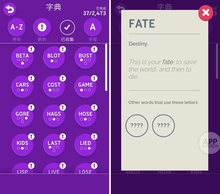 说到这里,你可能会说:「这跟平常的拼字游戏有什么区别?」嗯,下面就是重头戏了:这个游戏居然有图鉴功能,供收集你拼过的单词!你可以在图鉴中查看拼过的单词的意思,以及同一组字母可拼合的其他单词。对于大部分人来说,即使是看熟悉的词的英英意思,应该也算是提高英语的一个重要手段吧。
