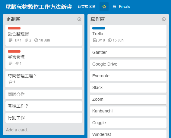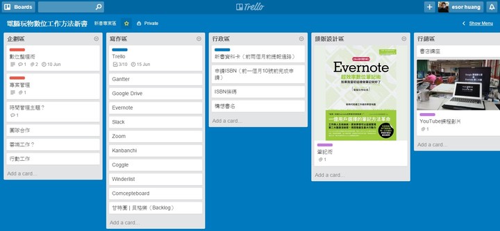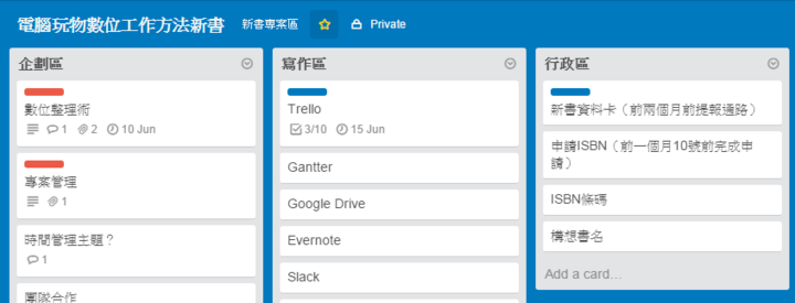 例如下图中我要完成一本新书,会需要企划阶段、写作阶段、行政流程、设计阶段、行销规划等等,我可以把每一种工作阶段设定成不同的清单,也就是不同的工作区域,串连起完成一个大专案的生产线流程。
