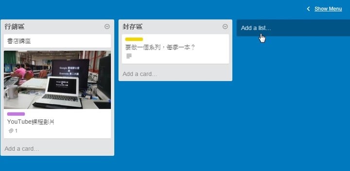 首先 Trello 可以让你在一大块看板(Board)中建立无数个「List」清单,你要整理某种资料、你要完成某个专案,需要多少清单分类,都可以在 Board 中自由建立、自由排列,并且清楚的在整个墙上一览无遗。