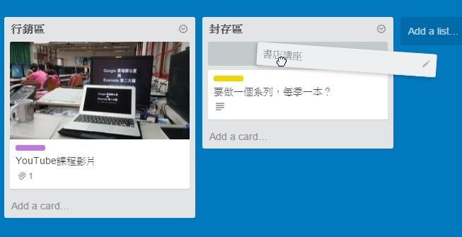 在 Trello 建立多条清单后,就可以在 List 内新增一张一张卡片(Add a card),什么是卡片?可以是一个任务、一份资料、一种想法、一个问题与讨论串,或是一张图片、一份档案、一次投票统计。