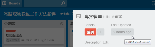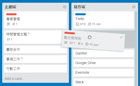 Trello 把「整理」与「管理」变成了视觉为主的直觉操作方式,当我看到某个任务最近开始变得很重要时,我会在清单上直接拖曳移动到最上方;当我看到某一个原本在企划阶段清单的任务已经讨论确认,我就会拖曳移动他到下一个执行阶段清单上。