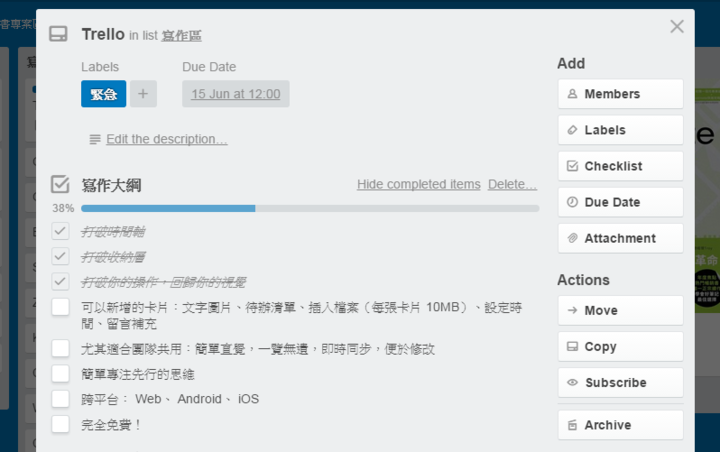 单独点开某一张 Trello 上的卡片,可以在卡片中新增更多细节的内容,或是增加更多需要记录的资料,以及加上重要的行动。