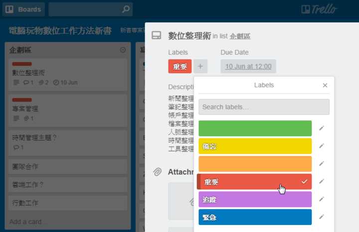 第一个方法是利用前面加入颜色标签的方式,在某张卡片加入指定的颜色标签,我们还可以自订每种颜色标签的名称,这样便利贴墙上就会有特别的颜色来方便辨识出这张卡片。