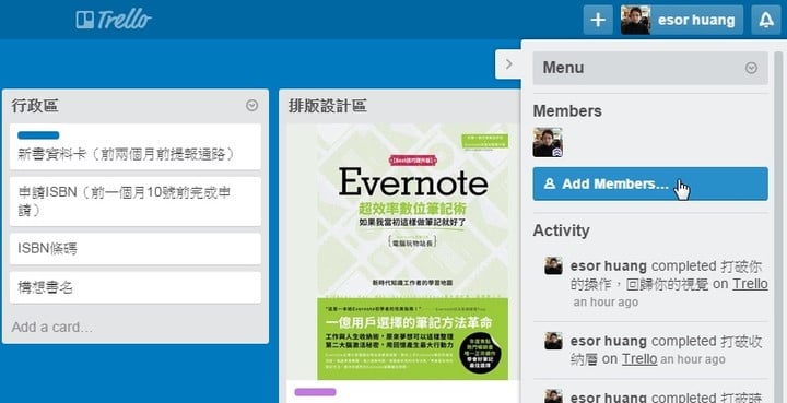 只要在 Trello 右方选单里选择[Add Members],就能加入任何成员一起来管理你的看板。