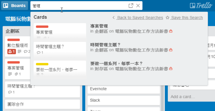 很棒的是 Trello 上方一直有一个搜寻列,在这里输入关键字,就能找到我拥有的所有看板里的相关卡片,并且立刻进入该张卡片进行处理。