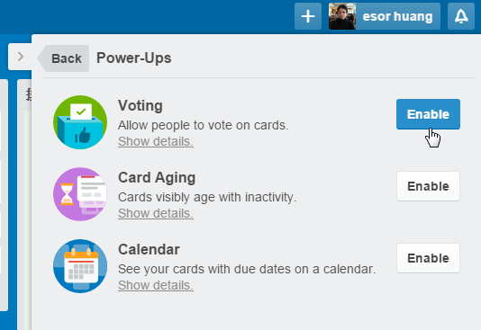 什么样的进阶功能呢?进入右方[Menu],选择[Power-Ups],就可以开启三个隐藏的进阶功能:投票、淡化旧卡片、行事历。