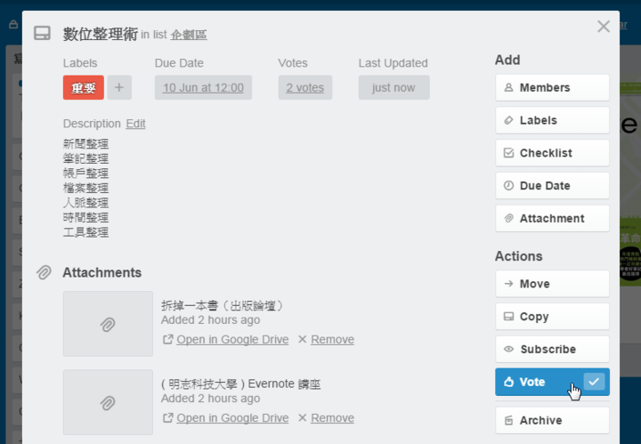 开启投票功能后,每一张卡片中会多出一个[Vote]按钮,点击后可以针对这张卡片投票。