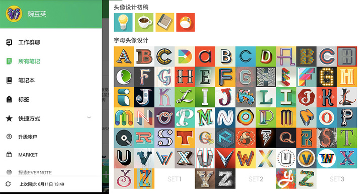 Evernote 首席设计师在公司内发起了一个自由项目,邀请全体设计师参与,不需要遵守 Evernote 的设计规范,只要求做出好玩的,让人印象深刻的头像设计。在入选的作品中,他们选择了三套不同的字母作为用户的默认头像。