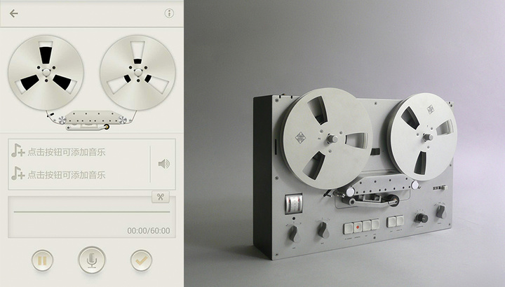 荔枝 FM 的录音界面源于德国德朗于 1963 年发售的博朗 TG60 型号的录音机。博朗在 20 世纪 60 年代做了很多有国际影响力的工业设计,荔枝团队非常推崇这个品牌。