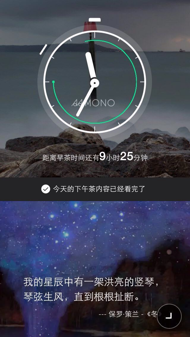 如果你把每期 MONO 推荐的内容看完,界面里会显示一只倒计时钟。这个时钟会随着背景变化并显示当前的时间。