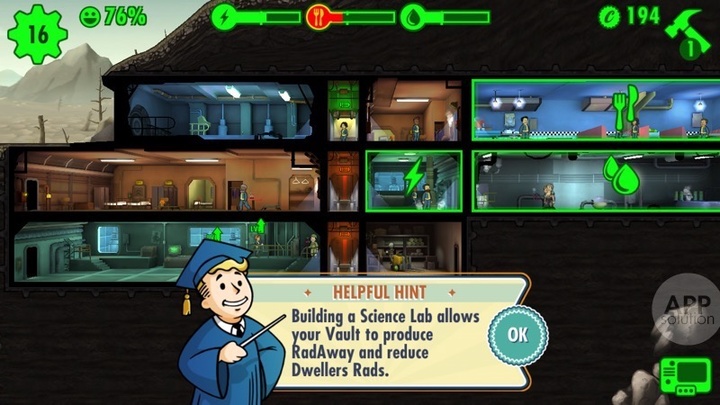 如果游戏引入原作中,避难所的社会学实验特性,相信会更加好玩刺激。作为一款模拟经营游戏,Fallout Shelter 丰富程度恰到好处,适合休闲娱乐,希望你会喜欢,至于脑残粉我就不多说了。