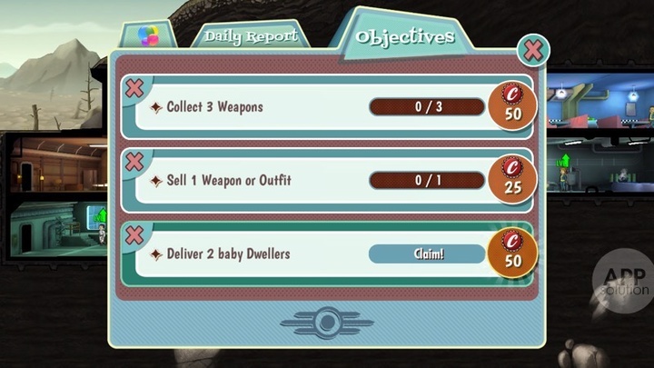 成就解锁作为手游流行的系统,在本作也不例外。完成任务便能得到的若干可乐瓶盖(Nuka-Cola),也就是游戏中的通行货币。「午餐盒」(Lunchbox)是 Fallout Shelter 中的唯一内购,非人民币玩家也可以通过完成任务来获得,午餐盒作为一种礼包,里面既有各种武器装备,也有资源货币,甚至还有居民赠送。