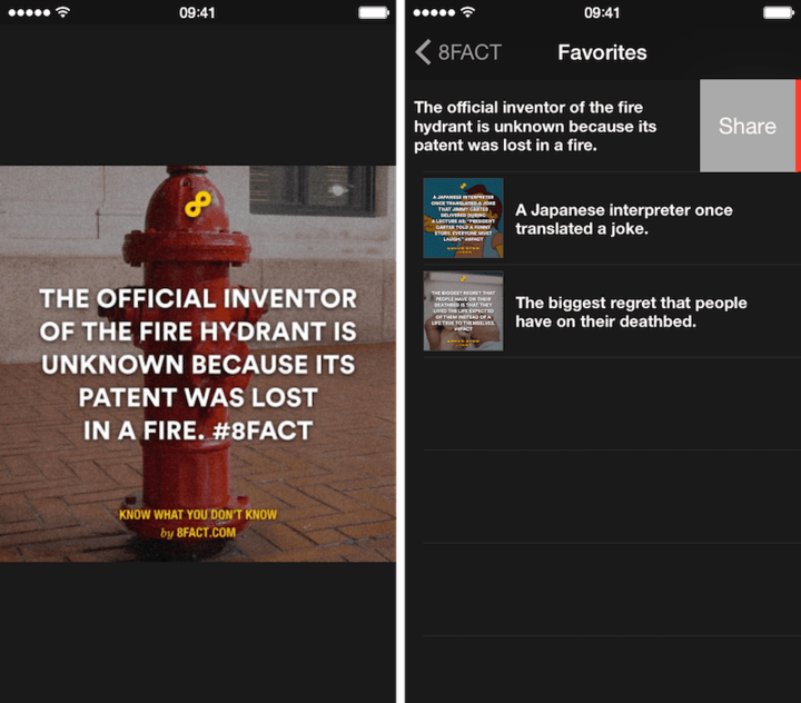 就像 8FACT 的副标题 Facts You Don’t Know 一样,这款 app 每天会更新几个关于各种方面,十分有趣的冷知识,有时会莫名戳中你的笑点。让你在轻松的同时,学到了有趣的小知识。