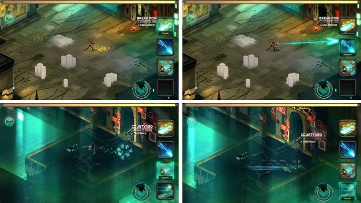 实时战斗模式就是传统的 ARPG 战斗模式;而冻结-规划模式则是 Supergiant Games 在Bastion 的基础上突破的一个系统,玩家可以在战斗过程中冻结时间,根据屏幕上方血量下面的蓝槽余量来规划好移动、攻击或召唤等等动作,解冻后 Red 会像批处理一般把规划好的动作瞬间完成,作为代价,Red 将需要一段时间的只能移动无法攻击的冷却。