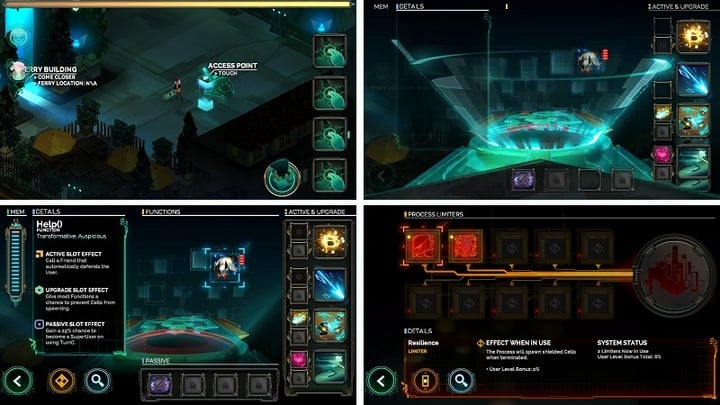 Red 和晶体剑会在前进的路上逐渐解锁多达十多种的函数技能。每个函数技能都可以作为主动技能(最多 4 个)/辅助技能(最多 8 个)/被动技能(最多 4 个)装载到晶体剑上。因此排列组合后的玩法变得异常丰富,如何搭配技能更爽快地击败敌人将是 Transistor 又一个值得我们不断尝试的地方。