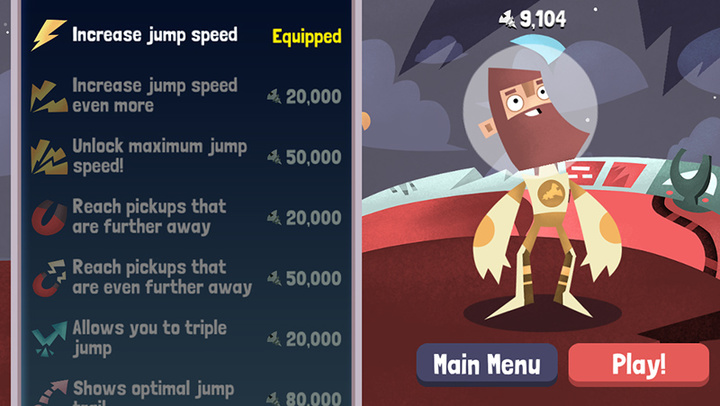 收集到的小零件打到一定数目时,玩家就可以到商店升级自己的装备了。可以通过升级让自己速度变快,也可以让系统显示最佳跳跃角度。当然,也可以只是买一些让自己变得好看的小装饰,比如说僵尸头。