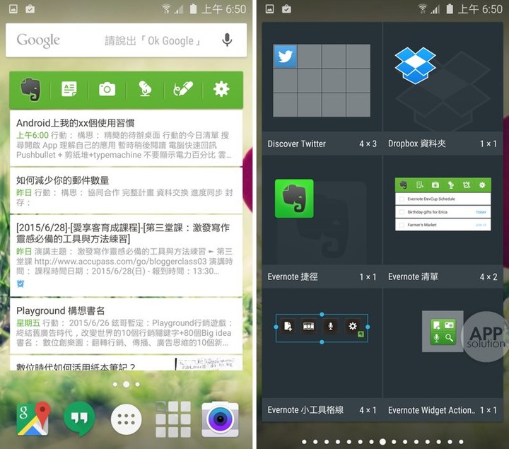 因此我现在只在 Android 第二个桌面上摆放唯一个桌面工具,就是 Evernote 的笔记任务清单。这是我之前提到利用零碎时间来做工作排程的概念延伸,我会在通勤或移动时打开手机这一页桌面,从任务清单里去思考有没有可以补充一些内容的笔记,或是安排等一下工作的顺序,当然也把临时想到的想法快速透过这个小工具新增到笔记中。