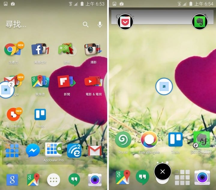 但是现在我自己则改变了这个做法,无论使用哪一种桌面管理 app,像是昨天介绍的 EverythingMe,或是我使用更长一段时间的 Google 即时资讯启动器,我都维持一个共通的桌面管理原则:只有一个摆放 App 的桌面。