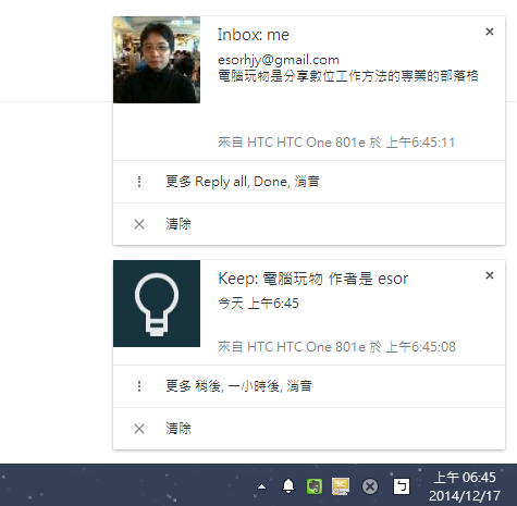 我爱用的 Pushbullet 在 Android 上还有一个妙用,就是他支持从电脑端回复 Android 上出现的通知,包含各种即时通(LINE、Hangouts、Facebook)的信息。