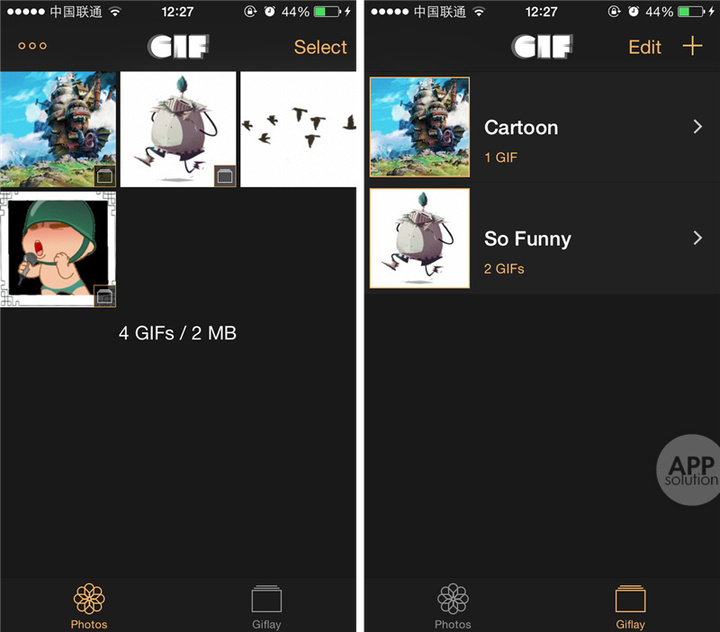 Giflay 能够自动识别「照片」里的动态图片,省去你导入的麻烦。「Photos」界面显示了所有可播放的 GIF,以及它们的大小。「Giflay」界面可以创建或编辑相册,方便用户整理动态图片。