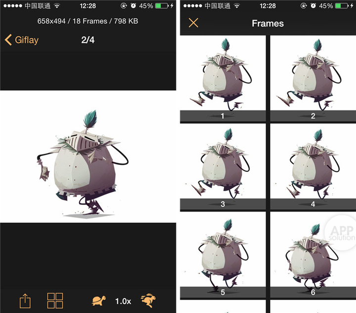 对于每一张动图的播放,Giflay 也是做足的功夫。首先,界面上方显示了 GIF 的基本信息,如分辨率、帧数和大小;其次,界面下方可以选择快速或慢速播放 GIF;最后,它还支持查看每一帧的图片,以及分享的功能。