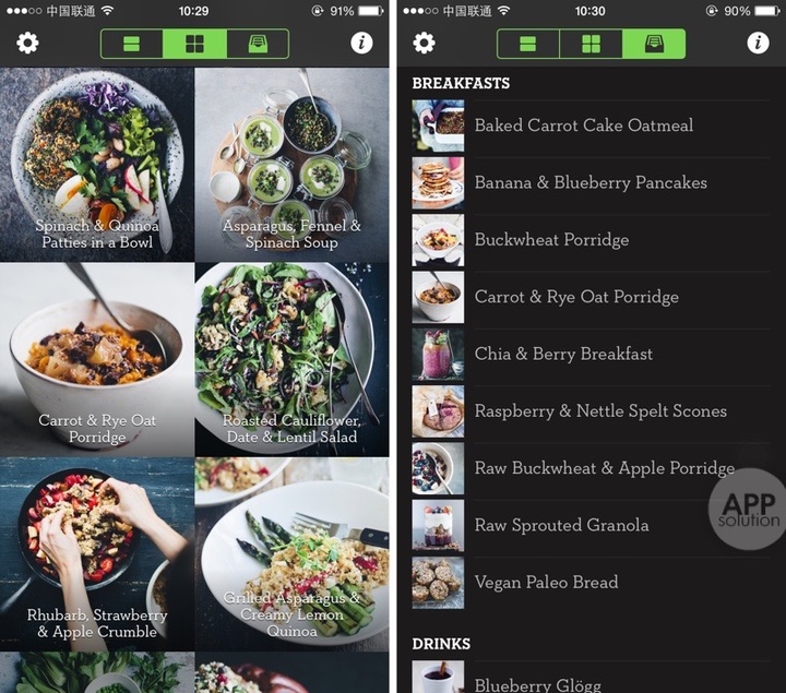 黑白配色的界面,辅以绿色标识,既简洁又暗合“绿色食谱”的主题。食谱有大图、小图、列表三种呈现方式,选择列表方式时还可以看到菜谱的分类。