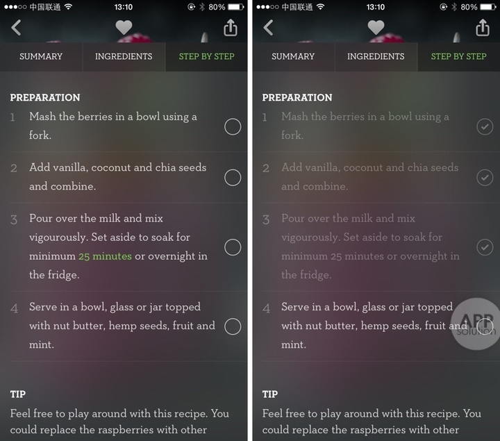 点击食谱图片,即可看到隐藏信息:Summary 中标明了耗时和供应人数;Ingredients 中标明了原材料的种类和份量;Step by step 中有详细的制作步骤,每完成一步都可以勾选相应项,更贴心地在重要步骤中高亮了时间。