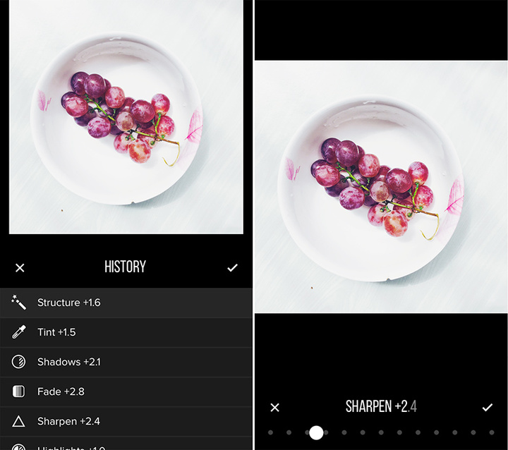 除了滤镜,Priime 还提供了亮度、清晰度、对比度等十项工具,供你进行精确到小数点位数的微调。调整完成后,点击 HISTORY 即可查看对这张照片所做的所有调整,并进行删减。