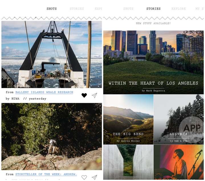 EXPLORE 细分了各种不同的户外旅行主题,关注的主题将会在 SHOTS 进行每日推荐。照片不论作为插图还是封面图,每一张都显得如此美轮美奂,让人没有任何理由不爱上此游历胜地。