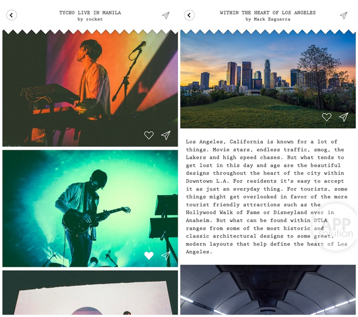 应用整体以白色为主色调,设计仿似一本纪念册的风格,操作上以左右划动手势来切换浏览主题。「SHOTS」每天推荐不同类别的单张风景照片,这些照片所属的游记故事收录在「STORIES」专辑中,每张照片和每个游记都能收藏到个人资料中并分享给好友。
