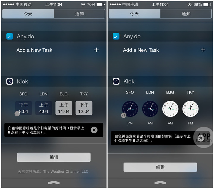 既然是一个主打通知栏插件的 app ,Klok 自然在通知栏工具方面有着出色的表现。简洁的扁平化设计能够让哪怕是最严苛的处女座都爱上,再加上钟表下面的小提示,相信你不会因在错误的时间打电话而被臭骂。