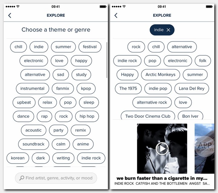 点击右上角进入探索界面,在列出的音乐风格、情绪、场景等各种标签中挑选出两个或直接在下方搜索标签,你就可以听到全世界的音乐发烧友们精心为你制作的歌单了。