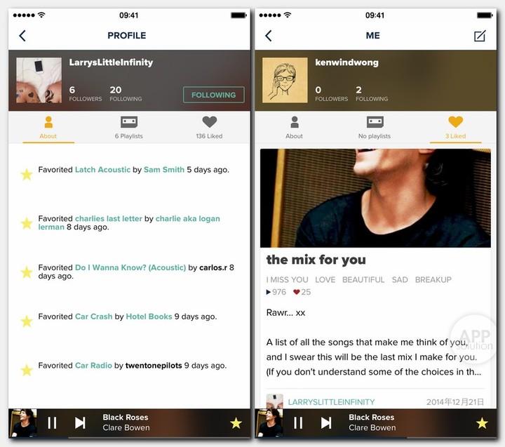 8tracks 深度整合了维基百科与 SoundCloud 的服务,方便你查看歌手的详细资料以及对歌曲的进一步了解。此外,只有你已听的歌曲才会在歌单的歌曲目录中出现,所以你永远不会知道下一首等待你的会是哪一首歌曲,这份神秘相信也会给你带来不一样的新鲜感。